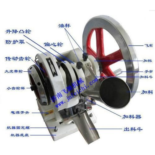 该单冲压片机特点是一种小型台式电动连续压片的机器,也可以手摇,压出的药片厚度平均,光泽度高,无需抛光。由于单冲压片机只有一付冲模,所以称单冲压片机;物料的充填深度,压片厚度均可调节。