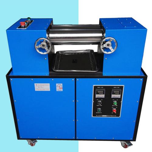 5)双辊开炼机压片时,辊筒表面硬铬处理,不能用金属制品刮磨表面(需用竹制),以免损伤其表面